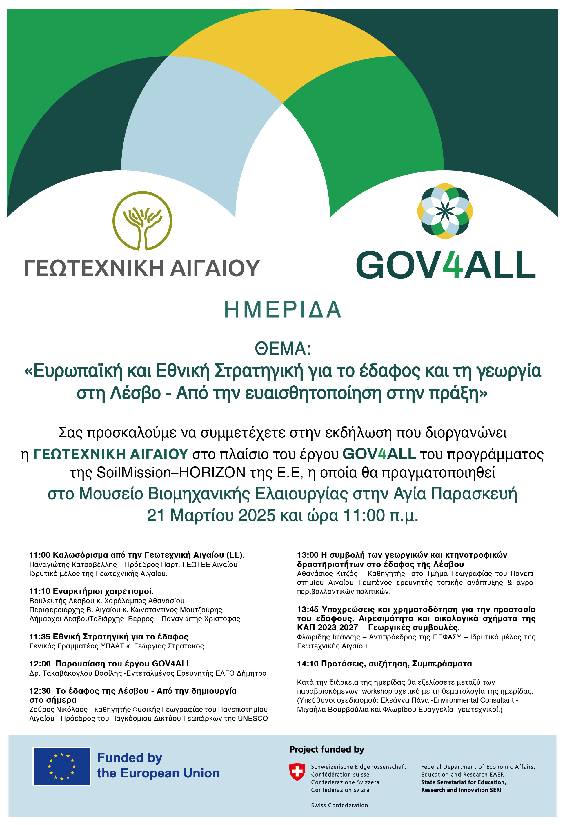 Σκοπός της συνάντησης: Η εκδήλωση στοχεύει να ευαισθητοποιήσει και να ενημερώσει τους ενδιαφερόμενους φορείς (αγρότες, επιστήμονες, πολιτικούς, ΜΚΟ και το ευρύ κοινό) σχετικά με τις Ευρωπαϊκές και Εθνικές στρατηγικές για την προστασία και την αναγέννηση του εδάφους, με έμφαση στη γεωργία της Λέσβου. Επιπλέον, επιδιώκει να ενισχύσει τη συνεργασία μεταξύ των τοπικών κοινοτήτων και των ευρωπαϊκών δικτύων για την υλοποίηση πρακτικών βιώσιμης διαχείρισης του εδάφους.